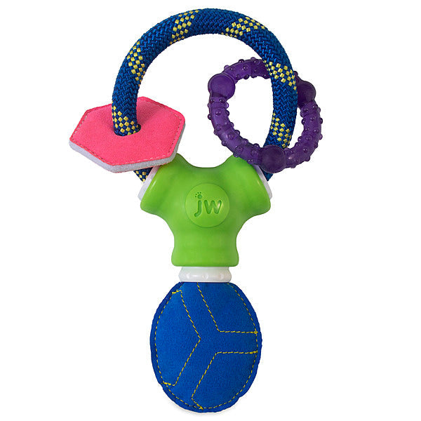 Keep playtime stimulating and engaging for your puppy with the customizable JW Puppy Connects Soft-ee™! This Puppy Connects Soft-ee features three activities in one toy: a rubber teething ring, a fabric teething ring, and a squeak-ee fabric pouch that squeaks as your puppy chews. Designed to stimulate all of your puppy's senses and provide a safe chew outlet for your teething pup, the Puppy Connects Soft-ee is carefully designed with a combination of comforting teething textures that are gentle on your puppy's mouth, yet durable enough to stand up to sharp puppy teeth. Easily customize the Puppy Connects Soft-ee with replaceable toys that simply twist in and out of the durable nylon center part of the toy. Keep your puppy entertained with multiple ways to play with the Puppy Connects Soft-ee.